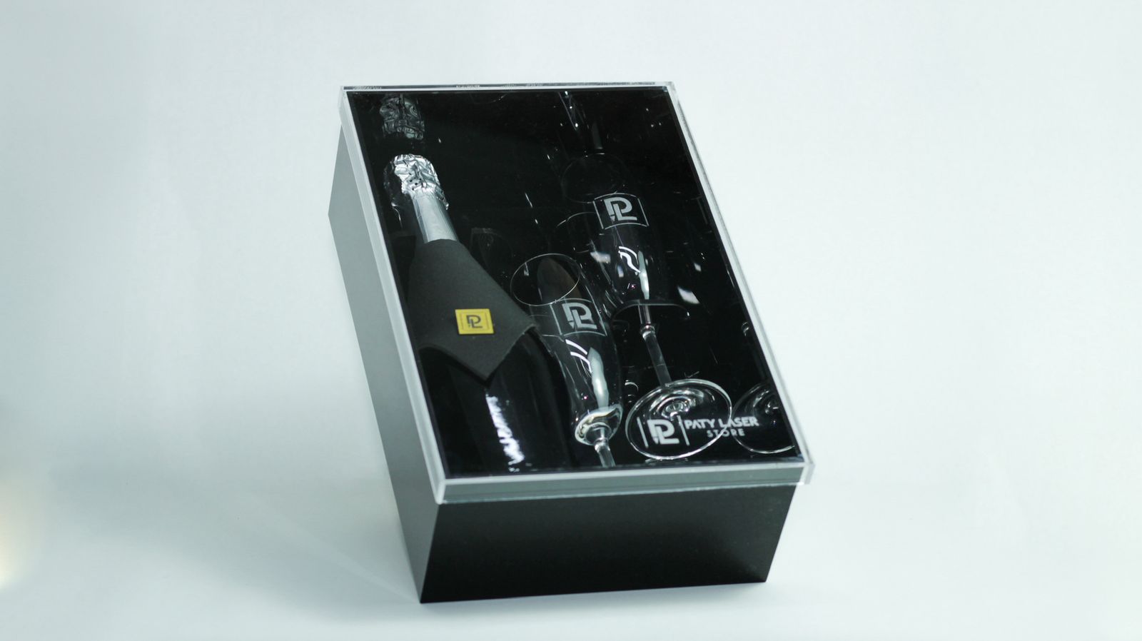 CAIXA ACRÍLICO BASIC/ESPUMANTE NACIONAL/ 2 TAÇAS CRISTAL PERSONALIZADAS/ GRAVATA EM NEOPRENE PERS. PARA GARRAFA/ PERSONALIZAÇÃO NA TAMPA PARTE EXTERNA/ LAÇO CETIM LISO COR A DEFINIR